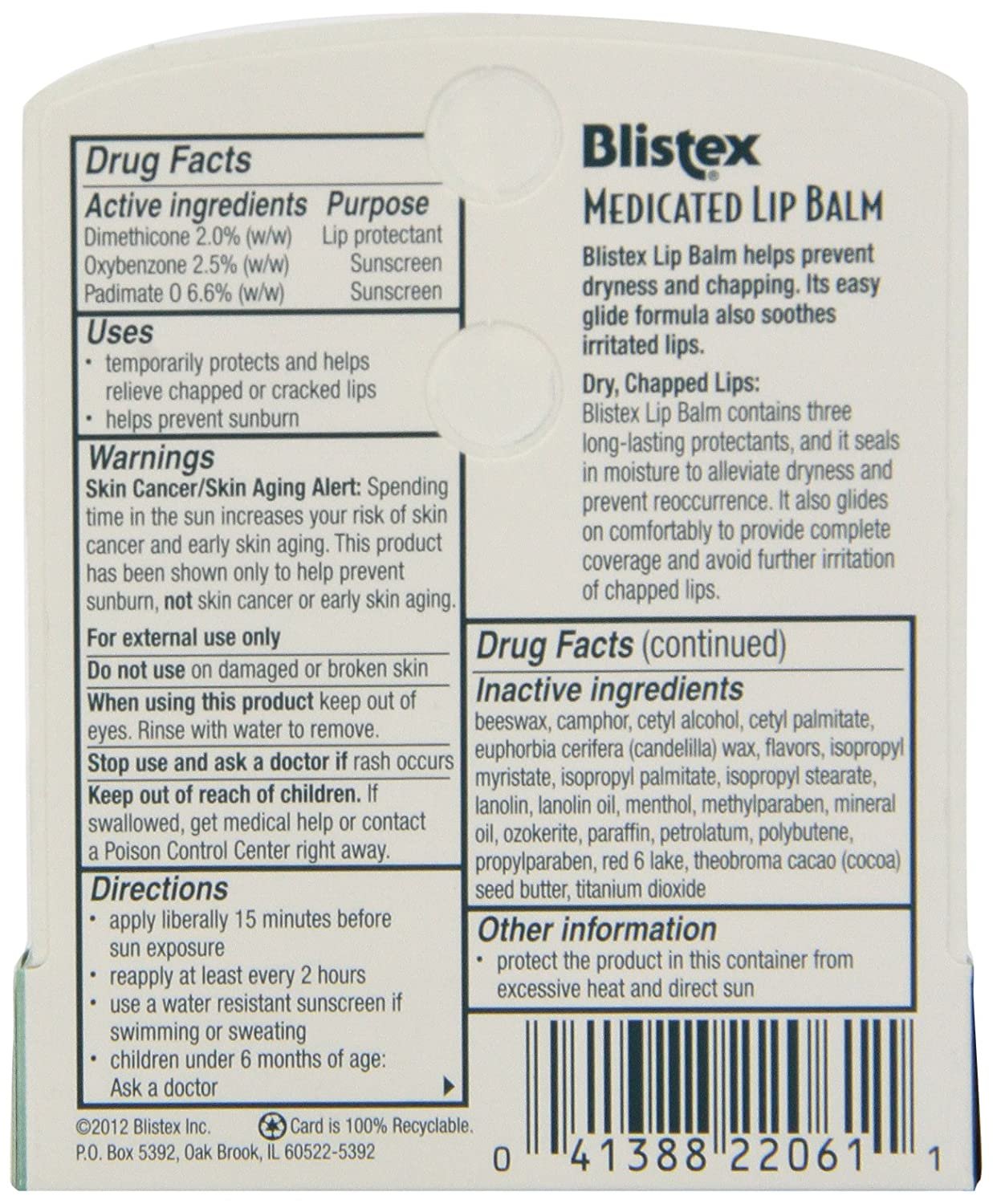 Lip Protectant/Sunscreen. Seals in moisture to soothe & prevent dry lips. Smooth easy-gliding protection. Blistex Lip Balm helps prevent dryness and chapping. Its easy glide formula also soothes irritated lips. Dry, Chapped Lips: Blistex Lip Balm has three long-lasting protectants, and it seals in lip moisture to prevent drying of lip tissue. It glides on comfortably to provide complete coverage and avoid further irritation of chapped lips. Sun Protection: Blistex Lip Balm provides SPF 15 protection. Remember, lips don't tan, but they do burn. Made in USA.