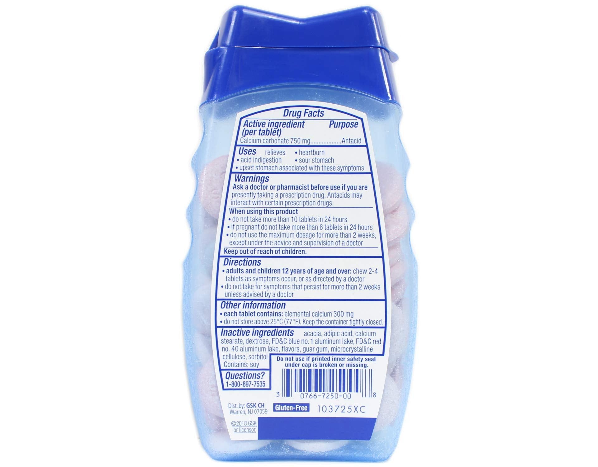 Fast and effective heartburn relief: Contains 750 mg of calcium carbonate per tablet to neutralize acid and provide quick relief from heartburn, acid indigestion, and sour stomach.
