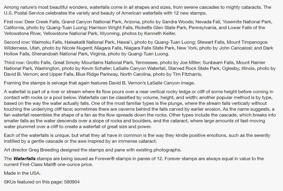 Among nature’s most beautiful wonders, waterfalls come in all shapes and sizes, from serene cascades to mighty cataracts. The U.S. Postal Service celebrates their variety and beauty with these 12 new stamps.