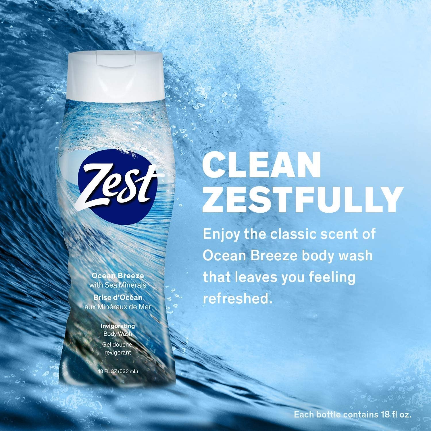 Zest Ocean Breeze Body Wash - Enriched with Sea Minerals - Rich Lathering Cleansing Body Wash Leaves Your Skin Feeling Smooth and Moisturized With an Invigorating Scent, 18 Fl Oz (Pack of 6)